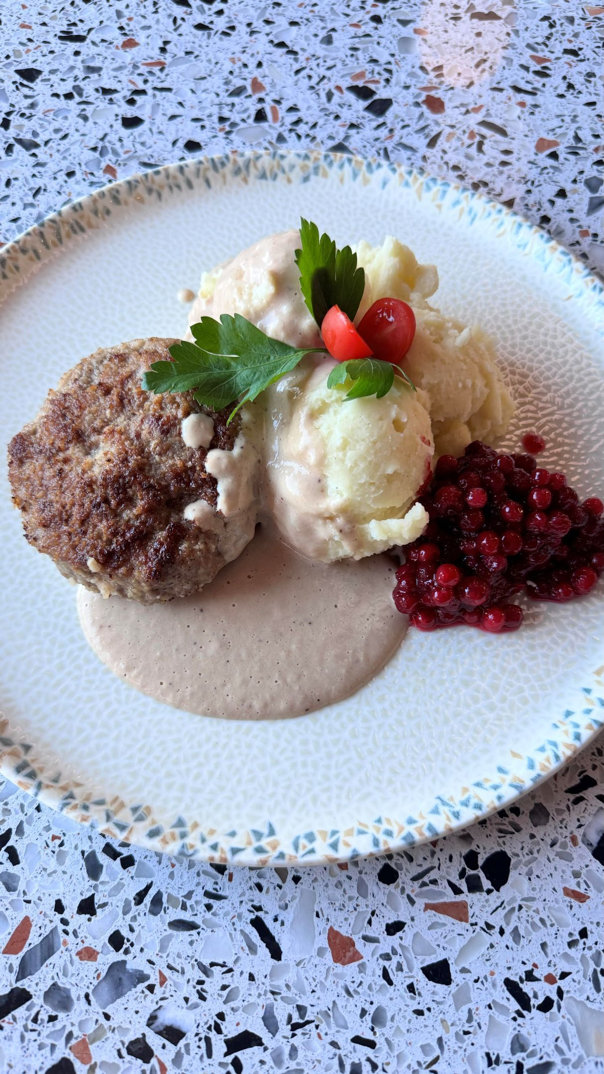 Ett spett grillad Lammfärs med grillad tomat, vitlöksyoghurt samt saffranris